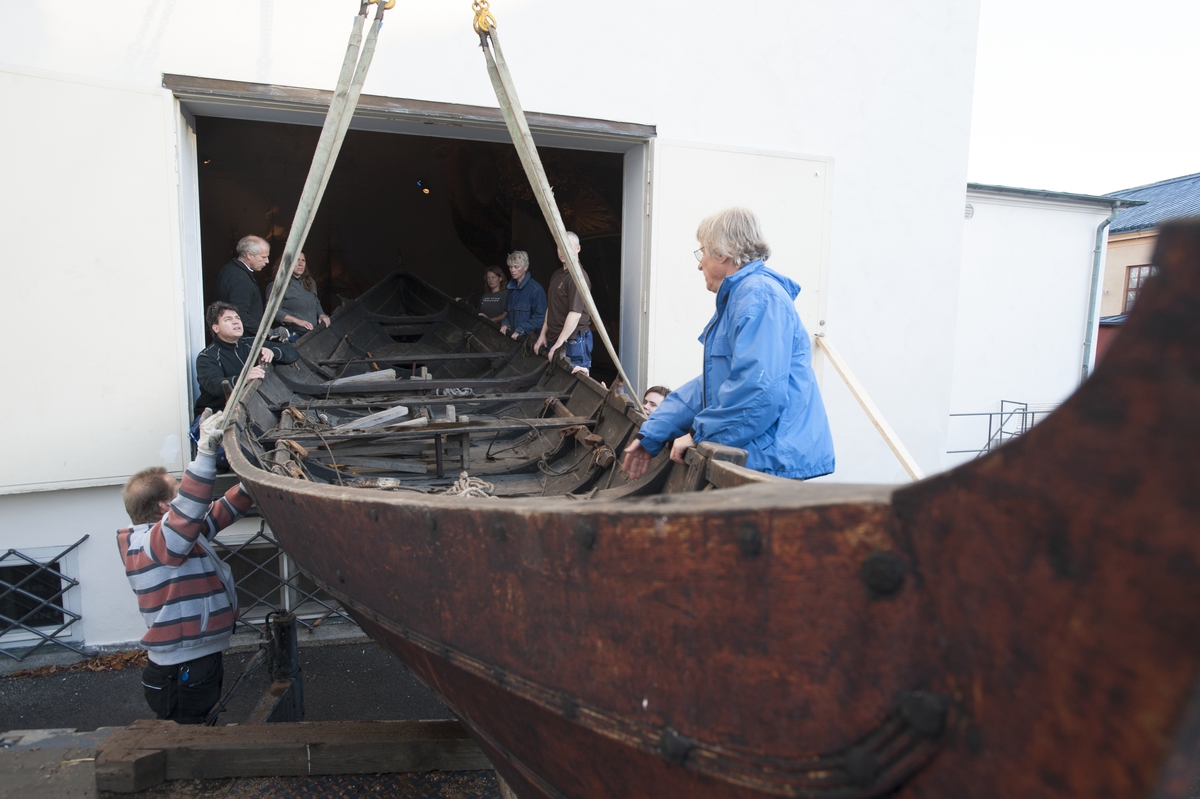 Vikingabåt TÄLJA lyfts in i Minneshallen på Sjöhistoriska inför höstlovet 2013