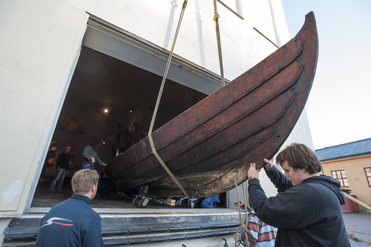 Vikingabåt TÄLJA lyfts in i Minneshallen på Sjöhistoriska inför höstlovet 2013