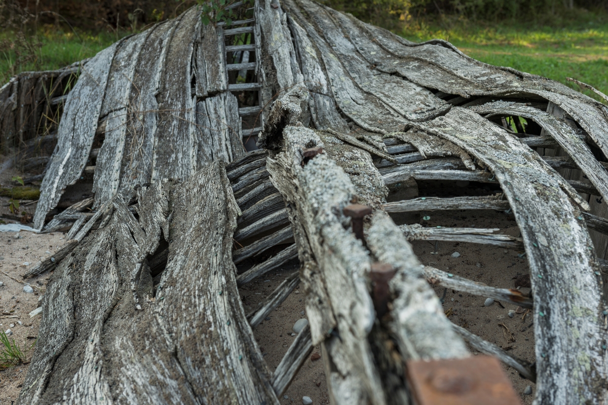 Båtvrak på stranden i Vikstadar som kan ha varit en livbåt som flutit i land 1944. I lokal hörsägen har båten antagits vara en baltisk flyktbåt.