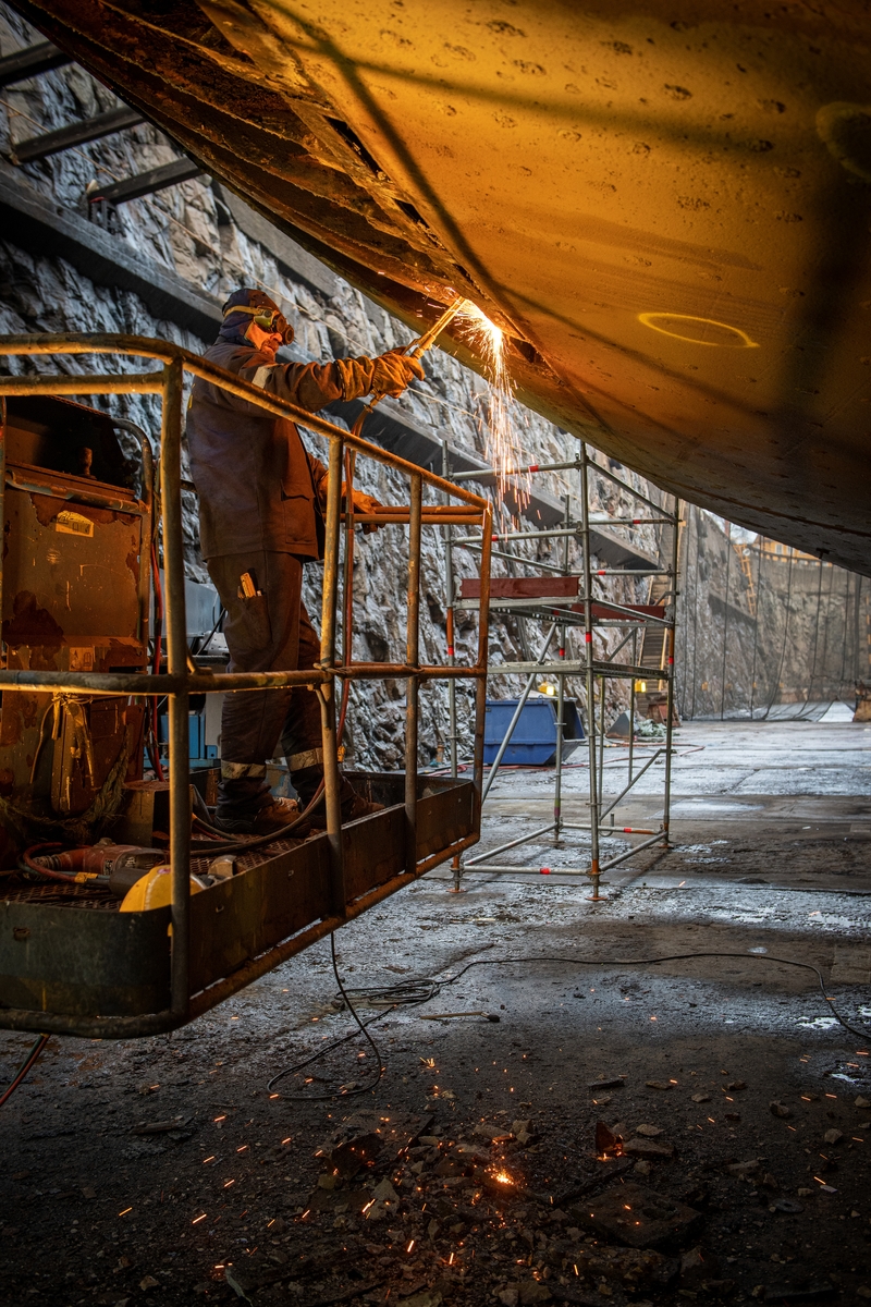 Isbrytaren SANKT ERIK på Stockholms Reparationsvarv, Beckholmen. Svetsarbeten på skrovet.