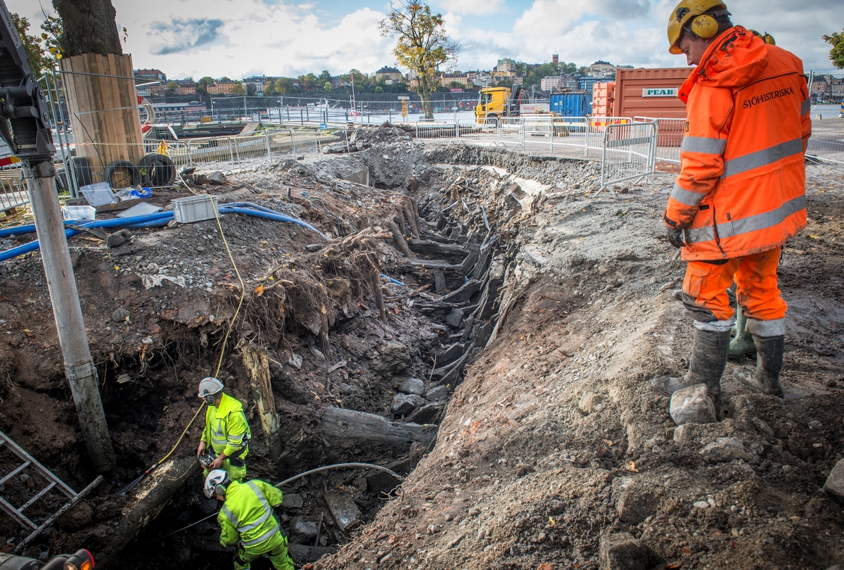 Titel: Vrak hittat sommaren 2017 under kajrenovering på Skeppsholmen, Stockholm. Har identifierats som Gustav II Adolfs flaggskepp Scepter (Spiran), sjösatt 1615. Skeppet deltog i flera sjötåg under kungens eget befäl innan det kasserades och återanvändes som utfyllnad vid anläggningar på Skeppsholmen år 1639.