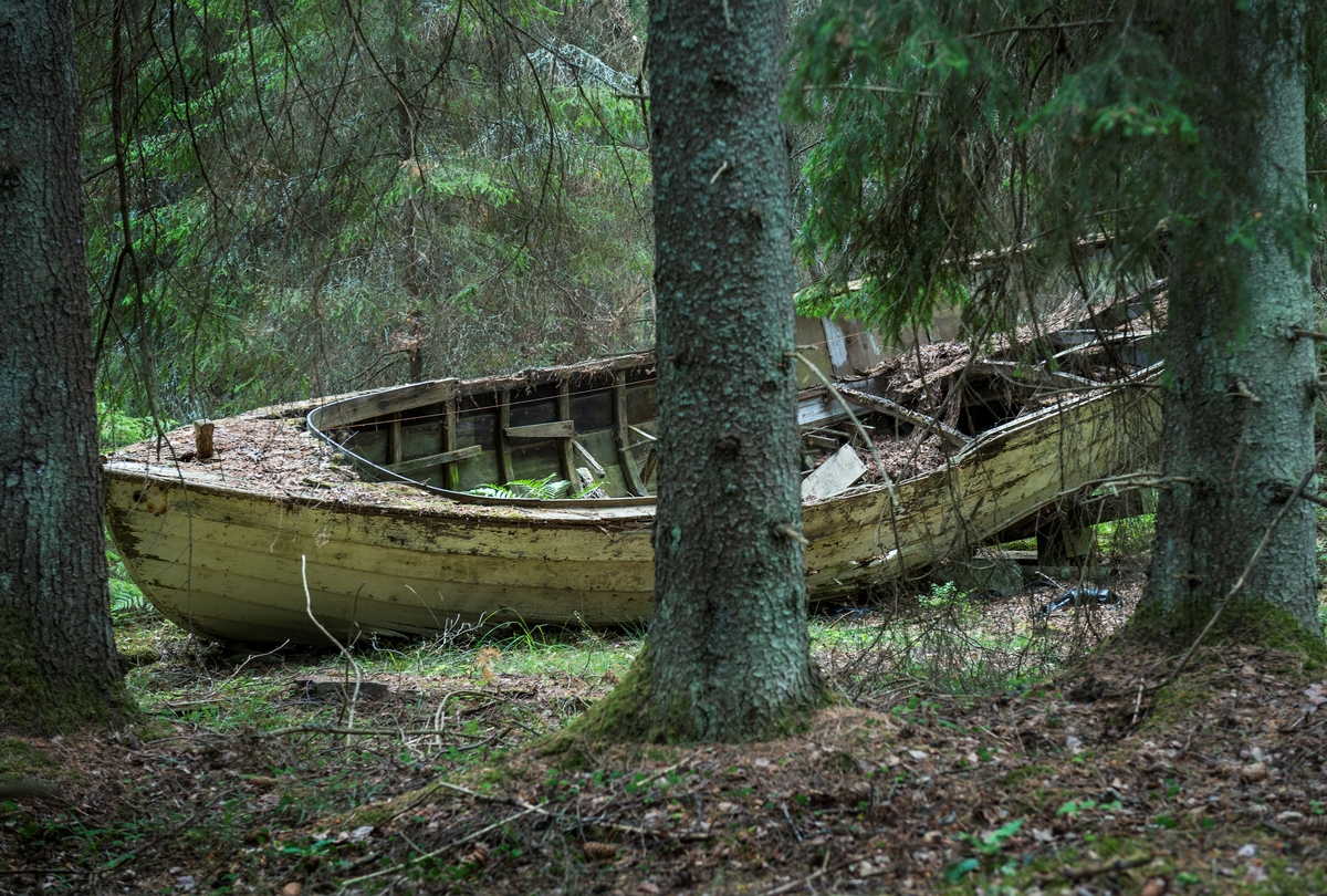 Förfallet vrak av baltisk flyktbåt i skogen på Järflotta. År 1943 användes båten av en grupp på fem för att fly från det Nargö och det ockuperade Estland till Sverige.