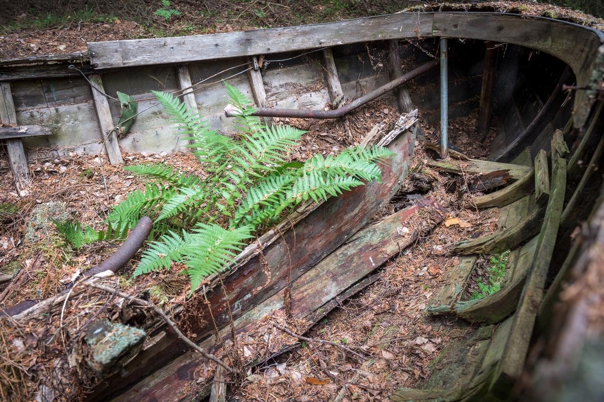 Titel: Förfallet vrak av baltisk flyktbåt i skogen på Järflotta. År 1943 användes båten av en grupp på fem för att fly från det Nargö och det ockuperade Estland till Sverige.