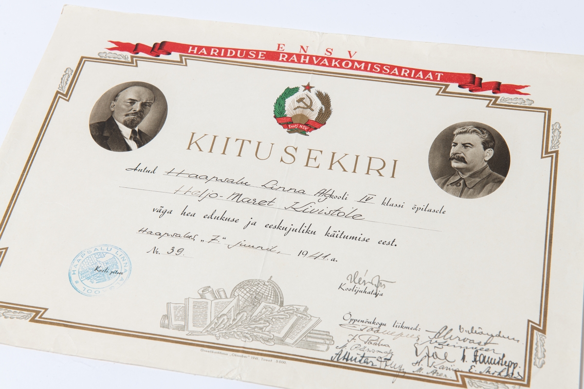 Diplom för väl utfört skolarbete, utfärdat i Estland under sovjetisk ockupation 1941. Diplomet medtogs på flykt till Sverige år 1944.