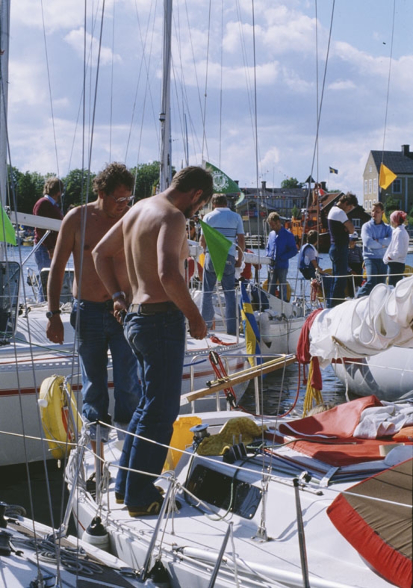 Två män ombord på Albin 78 Cirrus vid brygga.