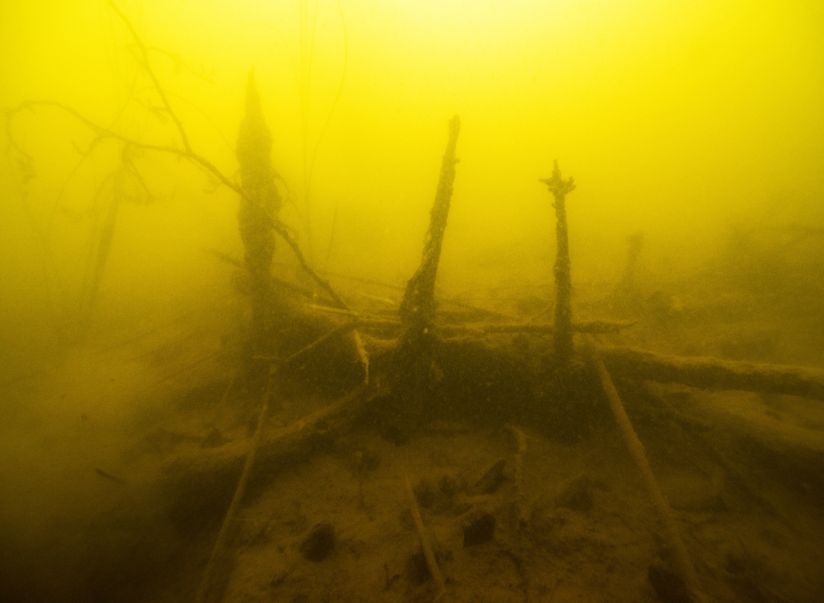 Fyra stående eroderade störar mellan vilka det ligger medvetet utplacerade grenar och ris.