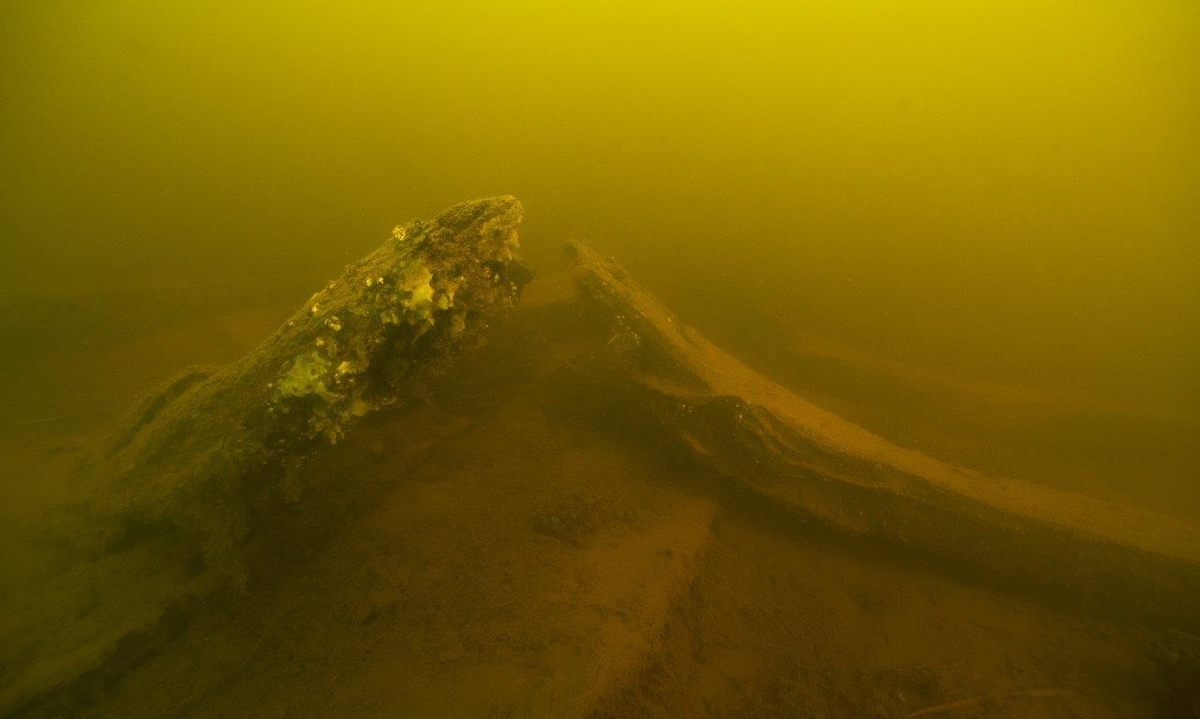 Bilden visar en fartygslämning. Man ser avbrutna spant och utfallen bordläggning. Lämningsnummer L2020:1811.
