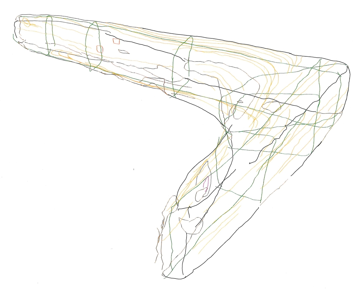 Faro arm-ritning av ett av de bägge knän (nr 107), som påträffades löst. Knäts sidor mätte 30 resp. 40 cm och det var 5 cm brett.