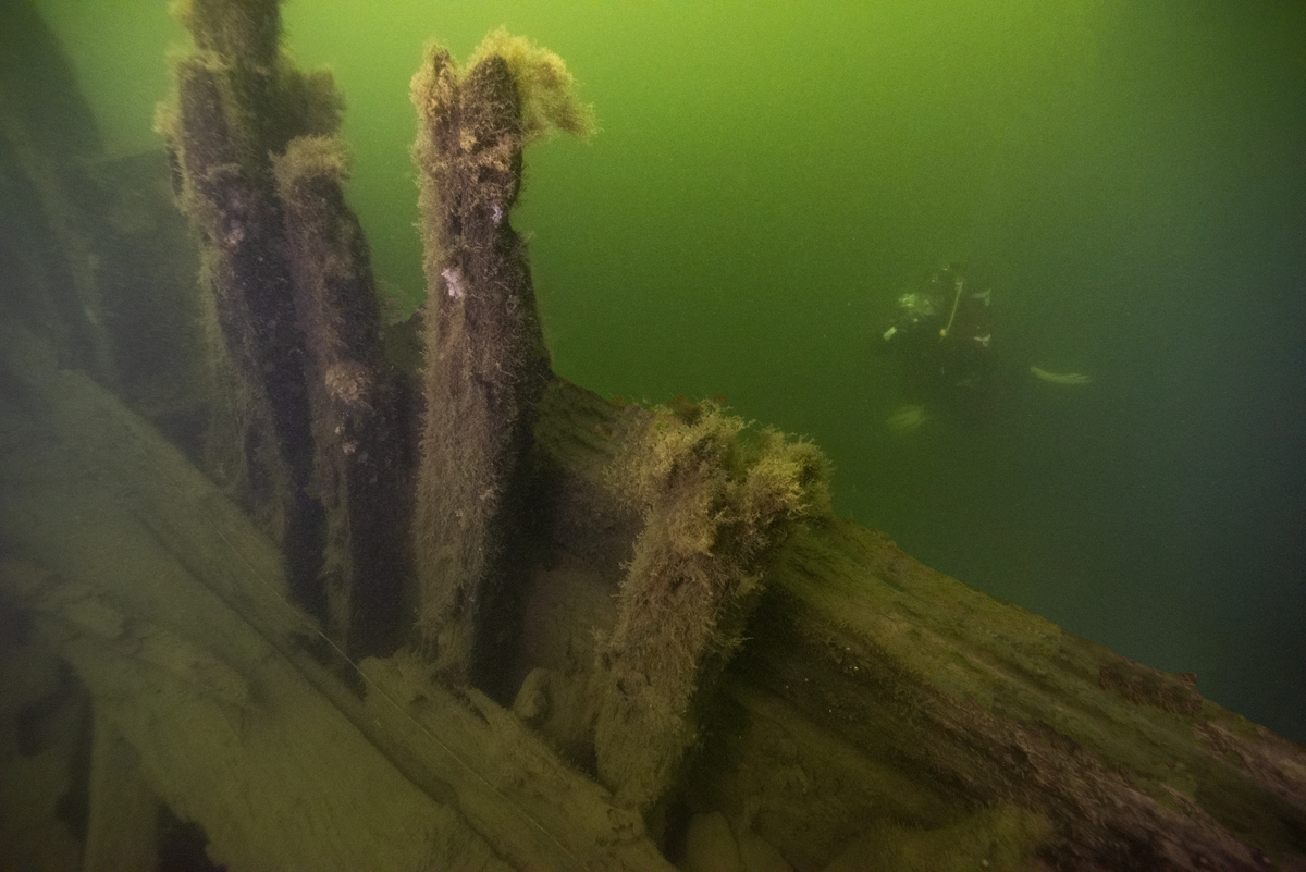 Bilden är tagen inne i vraket mot styrbordssidan. Röd pil visar en däcksplanka/vaterbord, blå visar innergarneringen, gul visar spanten och lila visar berghultet. Den dykande arkeologen befinner sig på utsidan en bit nedanför skrovsidan.