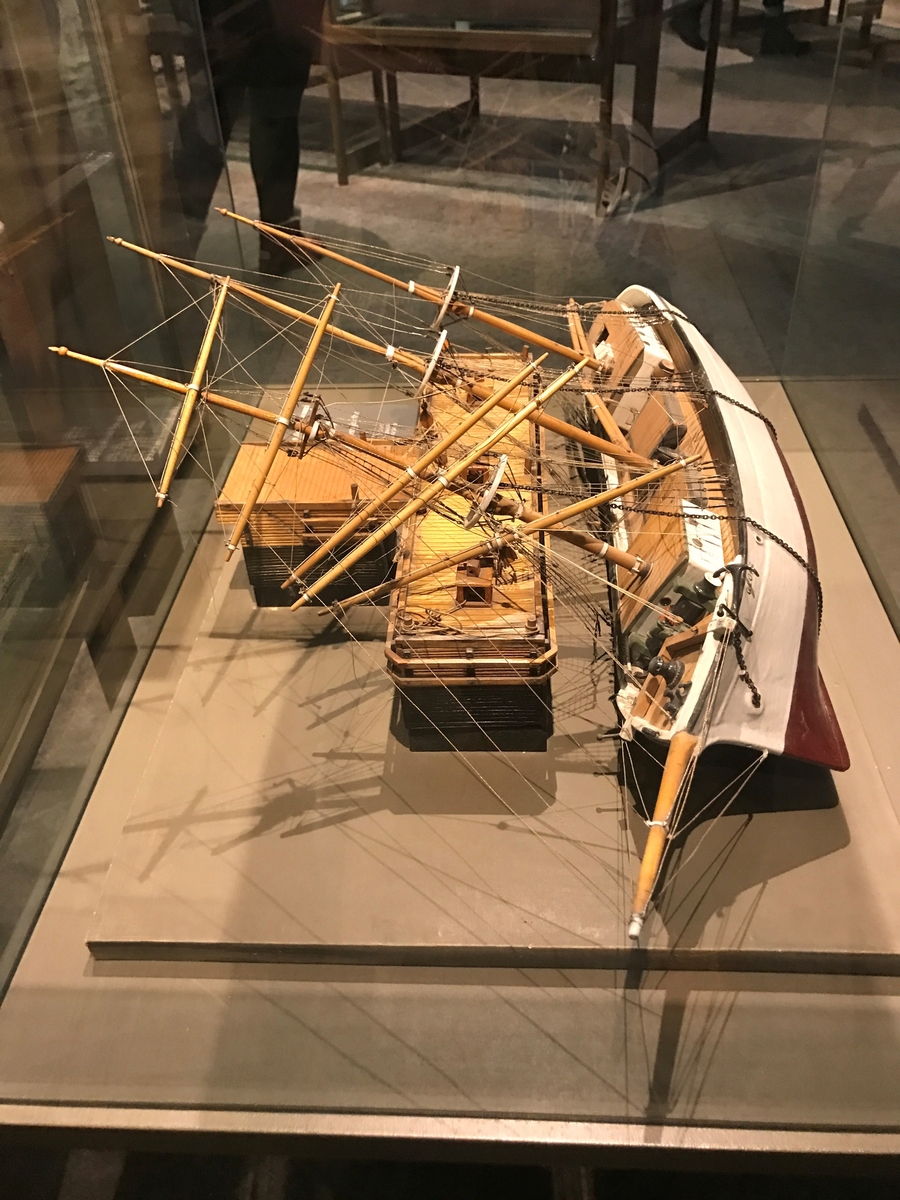 Bilden visar hur ett fartyg vindas ned på en brobänk för att komma åt att kalfatra samt reparera skrovet.