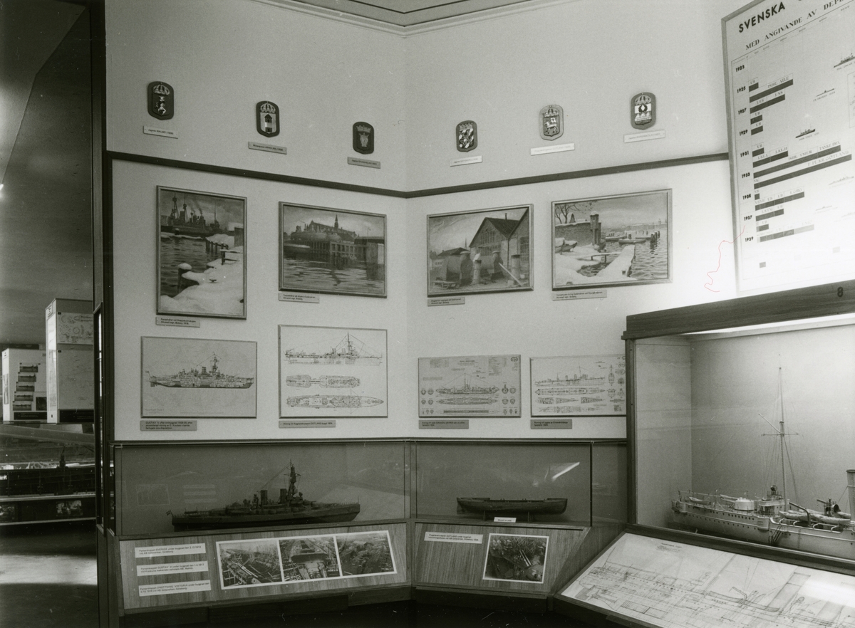 Sjöhistoriska museets permanenta utställning fotograferad 1987. Del av utställningen som handlar om svenska örlogsfartyg byggda inom landet 19051939. Fartygsmodell av pansarkryssaren FYLGIA samt två mindre fartygsmodeller.