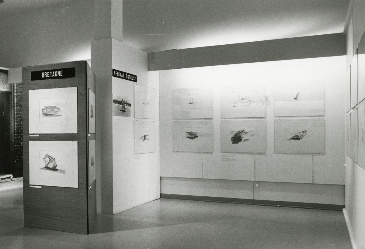 Utställningen "Vrak från kuster". Teckningar föreställande vrak från olika kuster av Signar Bengtsson. Teckningar från Bretagne och Afrikas östkust.