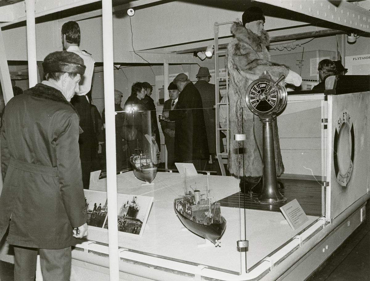 Utställningen "Vintersjöfart" på isbrytaren SANKT ERIK. Besökare tittar på utställninen vid vernissagetillfället.