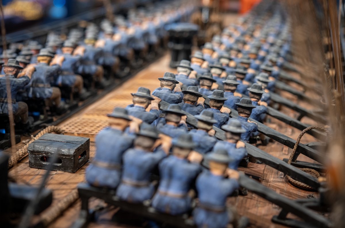 Modell av turumafartyget LODBROK (1771) i Sjöhistoriska museets utställning Klart skepp. Detalj.