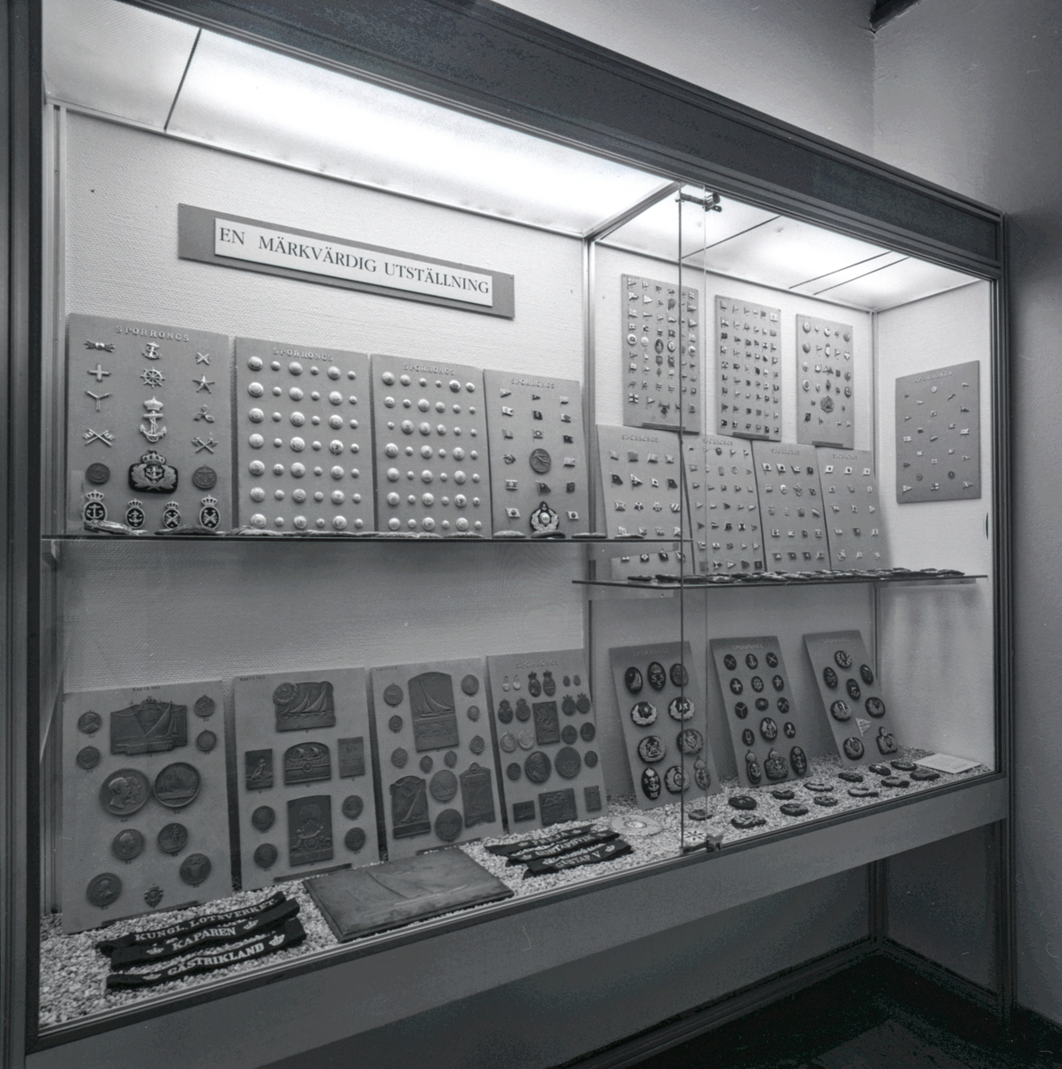 Utställningen "En märkvärdig utställning". Utställning i trappmonter med mössmärken, märken och tecken. Många tillverkade av Sporrongs.