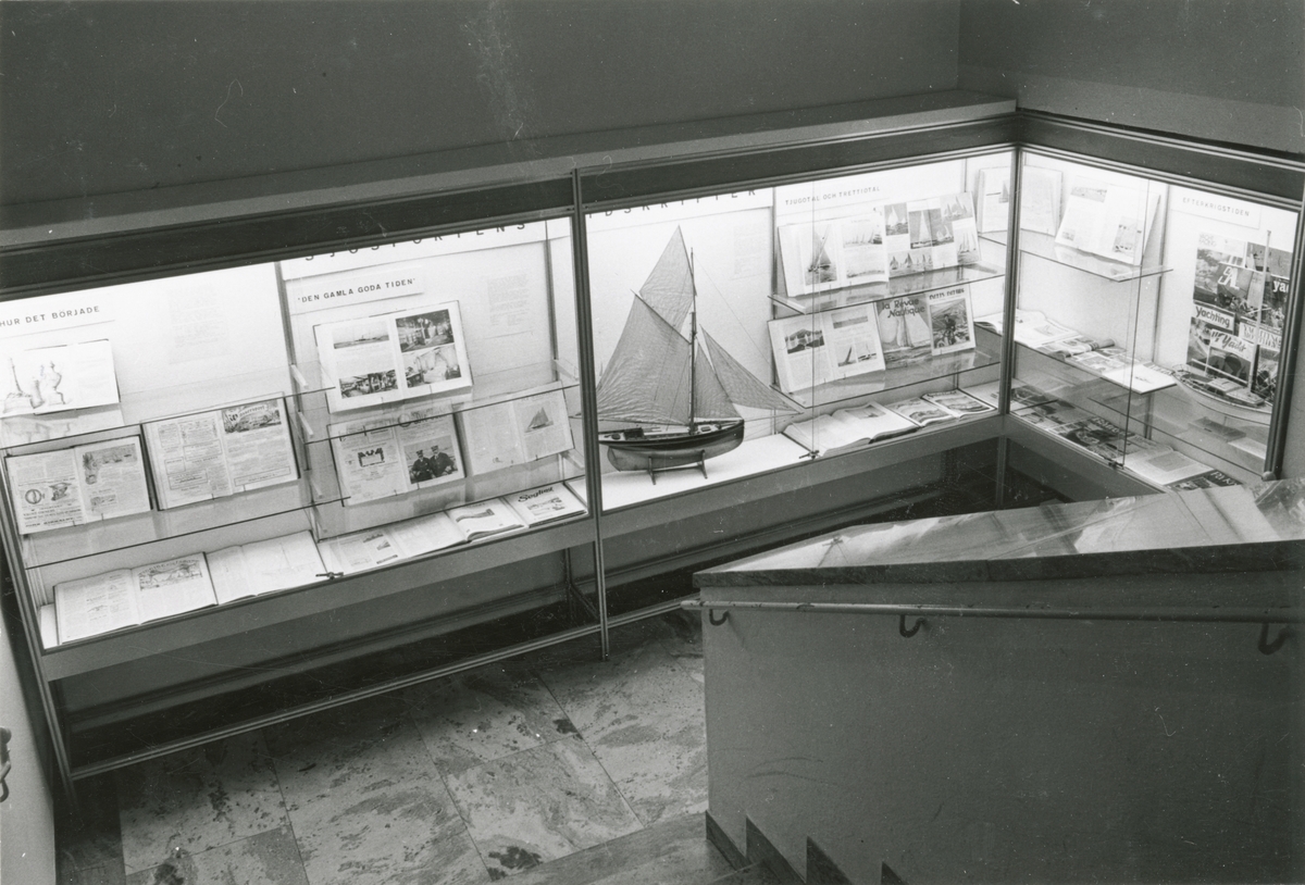 Utställningen "Sjösportens tidskrifter" i trappmonter. Hela montern med exempel på tidskrifter samt en fartygsmodeller.