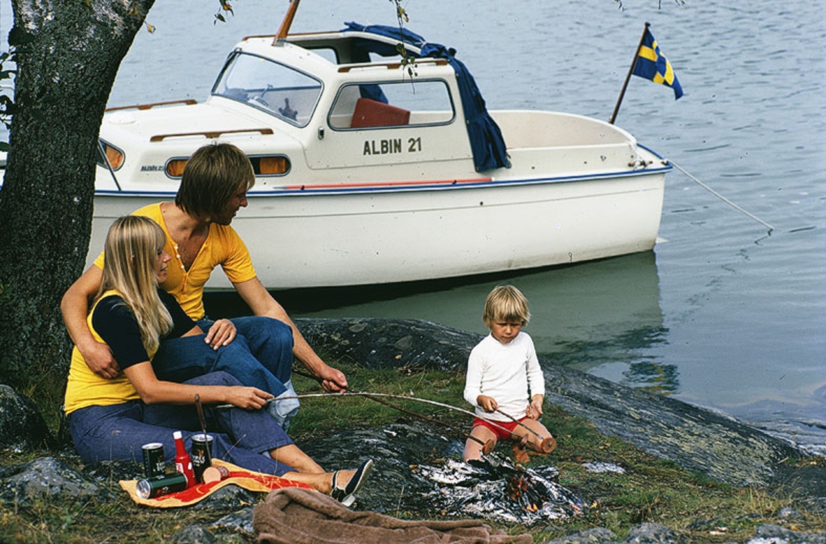 Albin 21 förtöjd i en vik. I förgrunden grillar en familj över öppen eld. Marknadsföringsbild.
