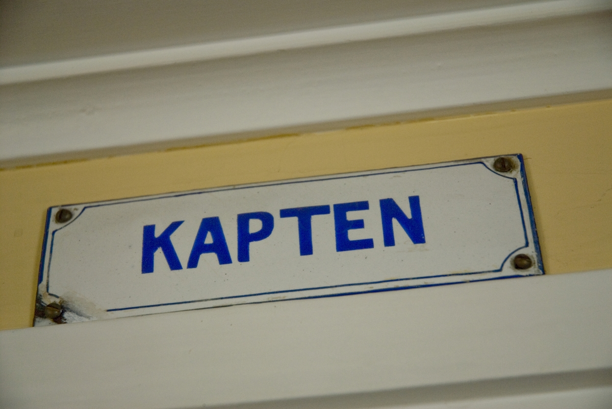 Interiör på isbrytaren Sankt Erik. Emaljskylt över dörren till kaptenshytten.