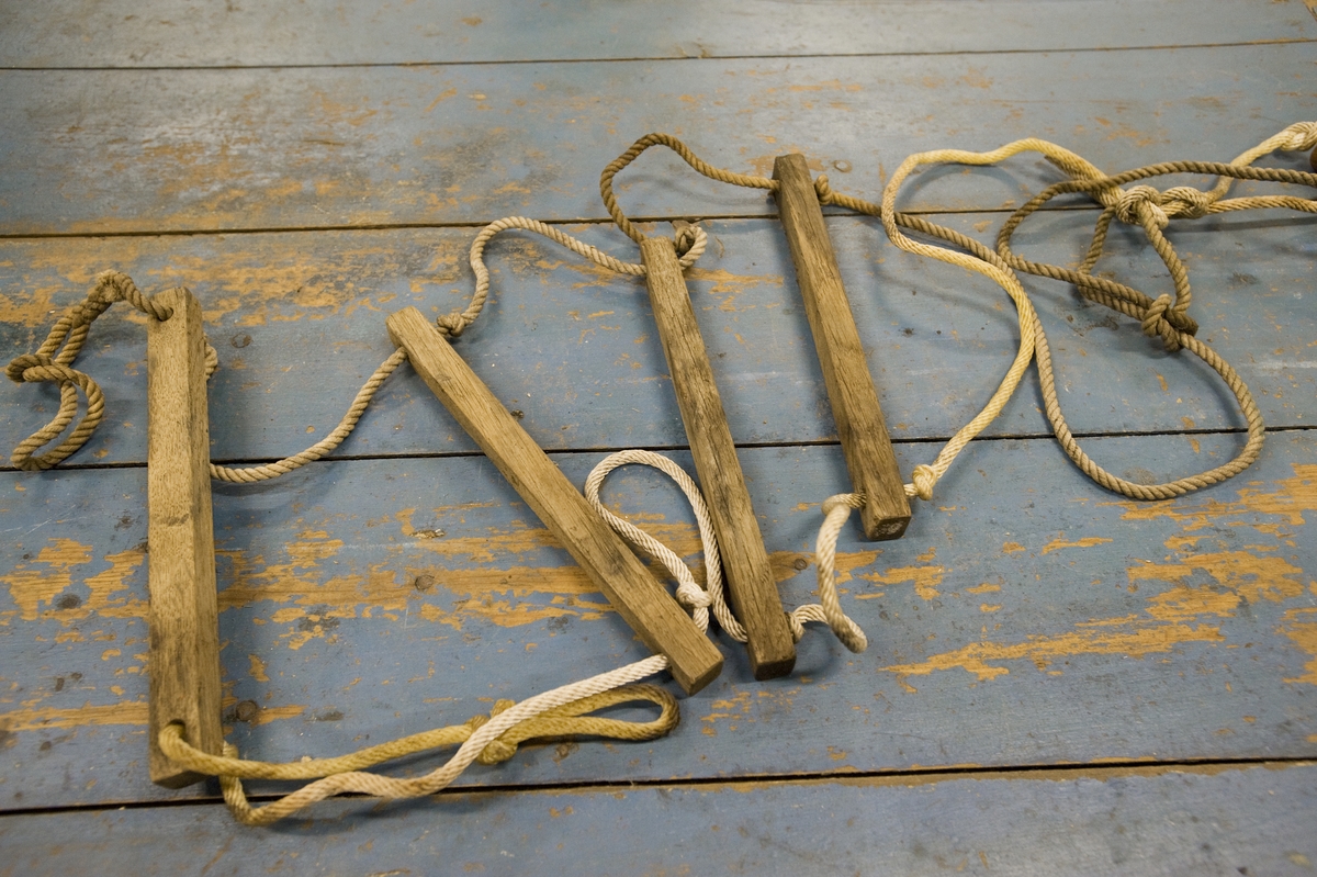 Repstege med 4 ribbor av teak. Petterssonbåten WIKING X i Båthall II.