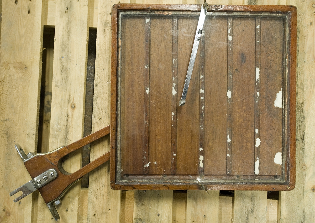 Hopfällbart sjökortsbord från Petterssonbåten WIKING X i Båthall II. Material maghogny, fällbart/vikbart. 41x41 cm, ben oräknat, öppningsbart och med glasskiva.