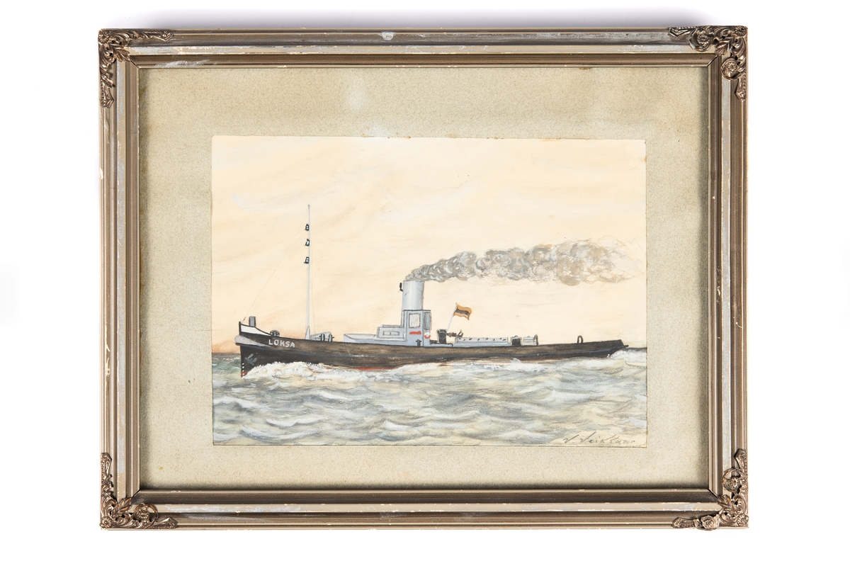 Målning i ram, föreställer bogserbåten Loksa som i september 1944 tog runt 50 flyktingar till Sverige från Tallinn.