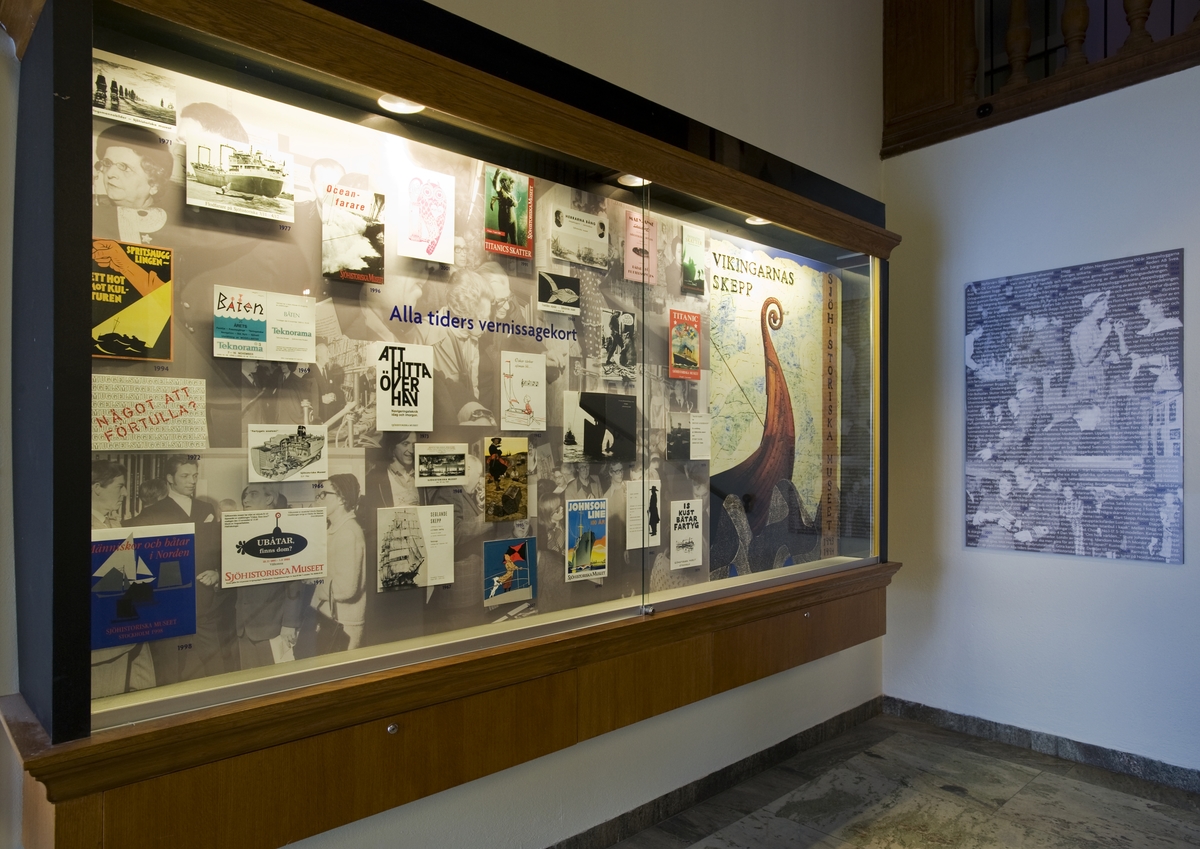 Utställning i trappmonter på Sjöhistoriska museet. Vernissagekort genom tiderna visas.