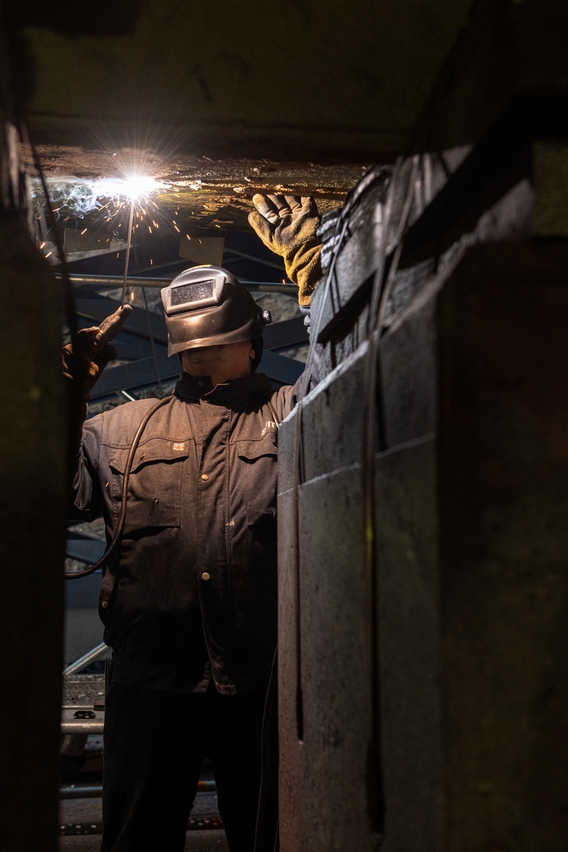 Isbrytaren SANKT ERIK på Stockholms Reparationsvarv, Beckholmen. Svetsarbeten på skrovet.