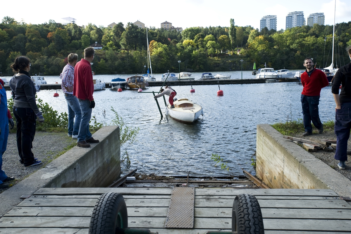 Båtupptagning på gammalt traditionellt vis, med handkraft, på Årstavikens SS vid Eriksdalsbadet 26 september 2009
