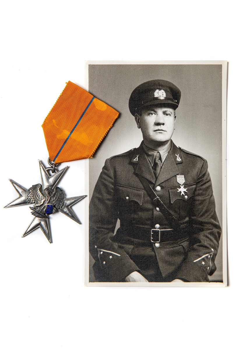Fotografi av Vello Kivisto iförd estnisk uniform, samt medalj tillhörande densamme. Fotot och medaljen medtogs på flykt från Estland till Sverige i september 1944.