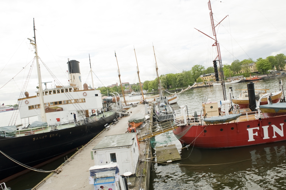 Museifartyg på Galärvarvspiren, Djurgården, Stockholm. T v isbrytaren Sankt Erik, t h fyrskeppet Finngrundet.