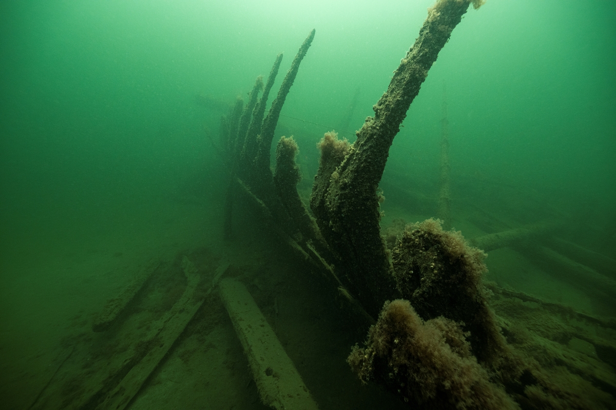 Bottenstockarna/spanten är kraftigt vinklade. Partier av bevarad bordläggning sitter