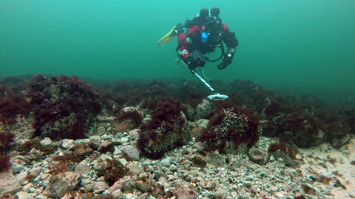 Jim Hansson söker med metalldetektor i Kopparsvik.