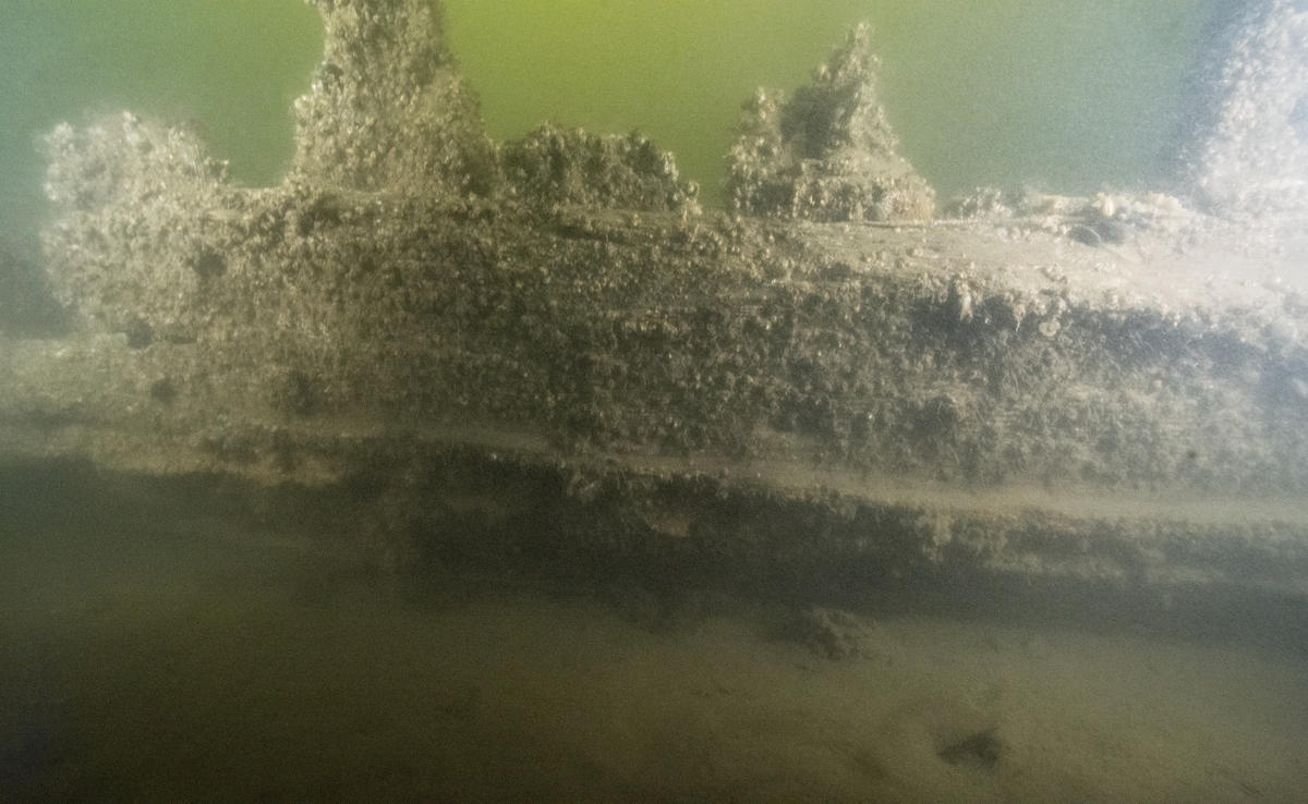 Fartygslämningen V3. På skrovsidan kan man se en så kallad berghult (kraftigare bordläggning) i skrovet. (V3/RAÄ Karlskrona 98).