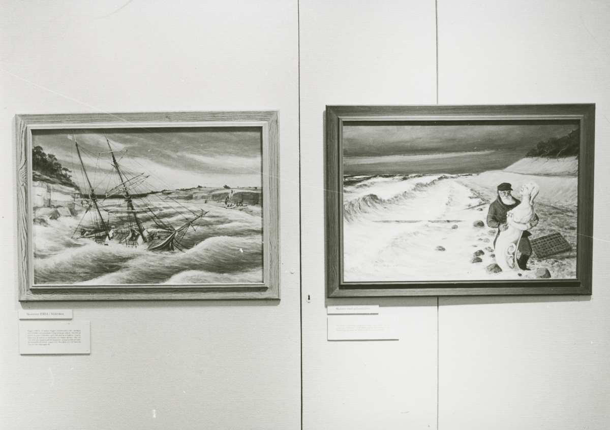 Utställningen "Gotland mitt i Östersjön". Målningar av konstnären Erik Olsson i Sanda. Del av utställningen med två konstverk, "Skonaren INDRIA i Hideviken" samt "Mannen med galjonsbilden".