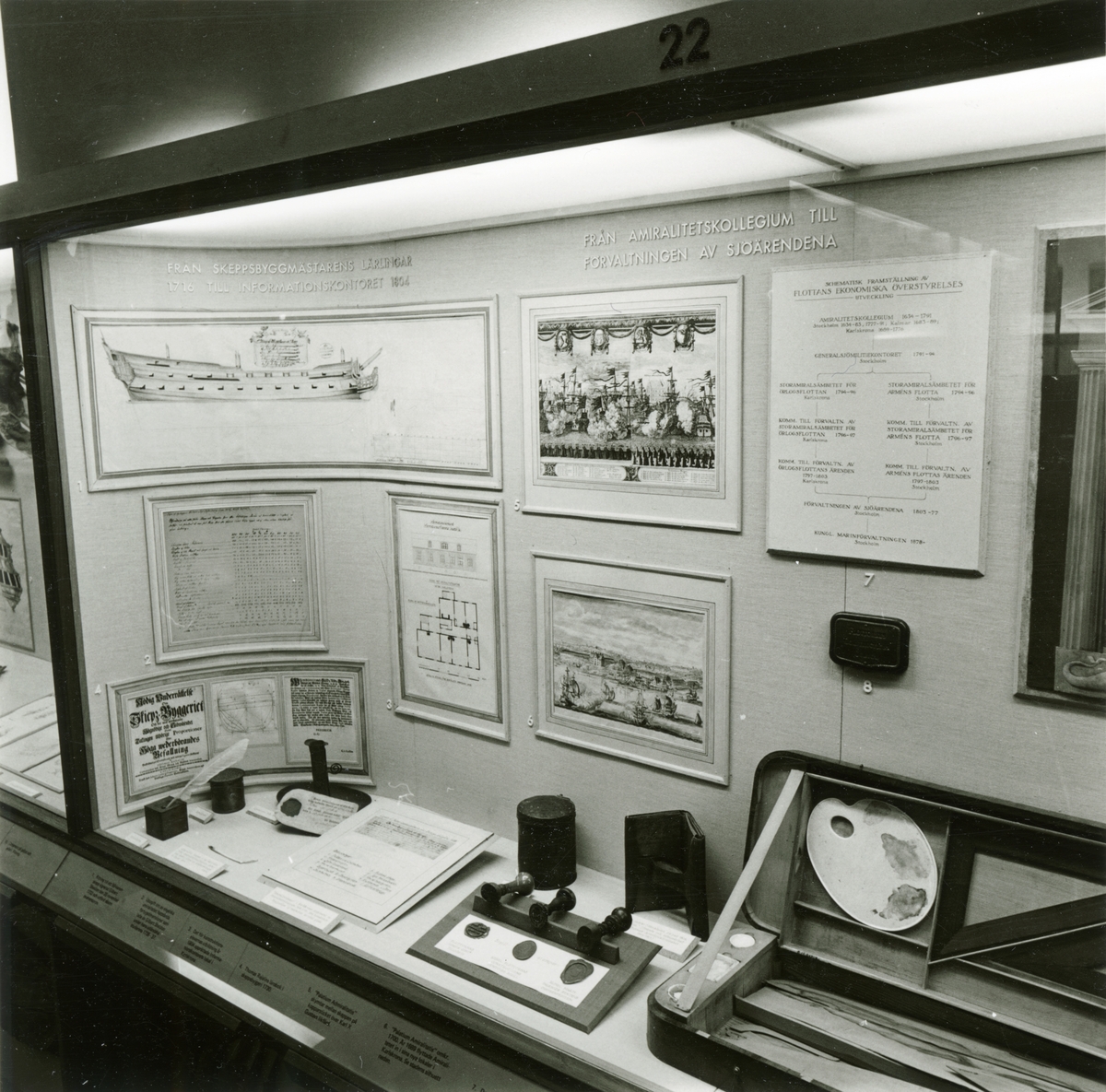 Sjöhistoriska museets permanenta utställning fotograferad 1987. Monter som visar Från skeppsbyggmästarens lärlingar 1716 till informationskontoret 1804 och Från amiralitetskollegium till förvaltningen av sjöärenden.