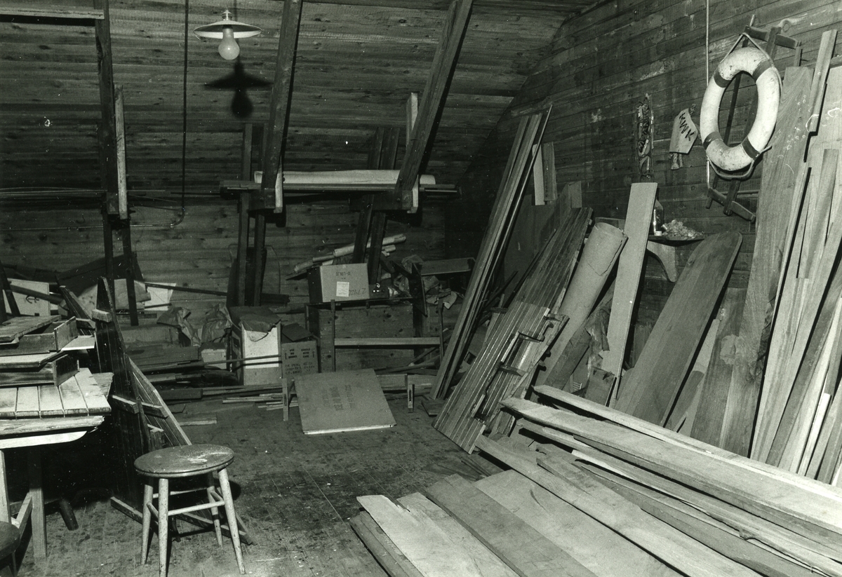 Utslagsvinden 1972. För att få spanten exakta tillverkade man av ritningen-arbetsbeskrivningen pappersmodeller av spanten i skala 1/1 som sedan användes som mallar vid tillverkningen av de riktiga Spanten. Detta arbetsmoment kallades utslagning. Utslagsvinden ligger på övre våningen i stora verkstaden.