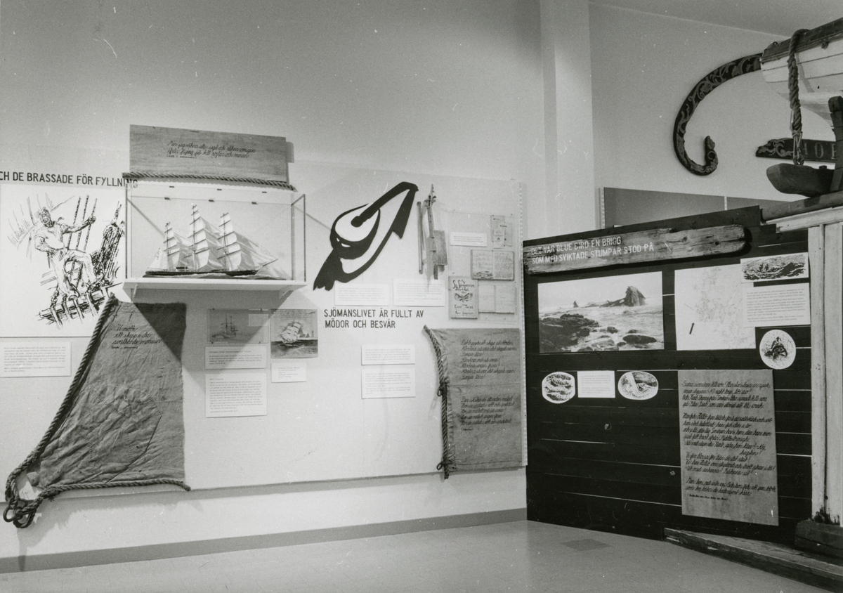 Utställningen "Hans namn var Frithiof Andersson om Evert Taube". "Sjömanslivet är fullt av mödor och besvär" och "Det var Blue Bird en brigg som med sviktade sumpar stod på". Utställningsöverblick.