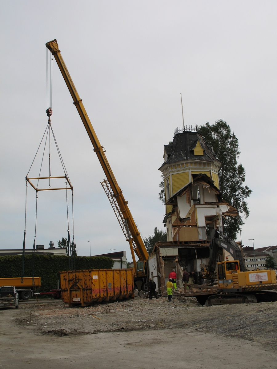 Titel: Strömsborg. Rivningen av huset och lyftet av tornet för flytt.