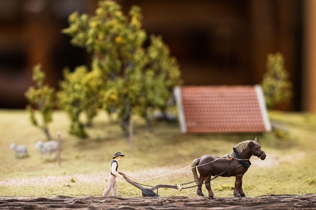 Dalslandsgård. Vinnsäter, Järbo socken. Detalj av modell, plöjning
