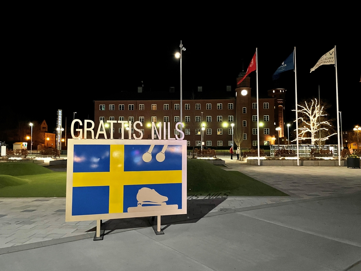 Trollhättan, Drottningtorget. Hyllningsskylt till olympiska mästaren Nils van der Poel