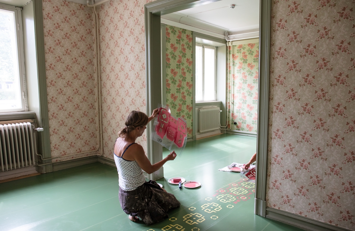 Vänersborgs museum. Schablonmålning av golvet i vaktmästarbostaden.