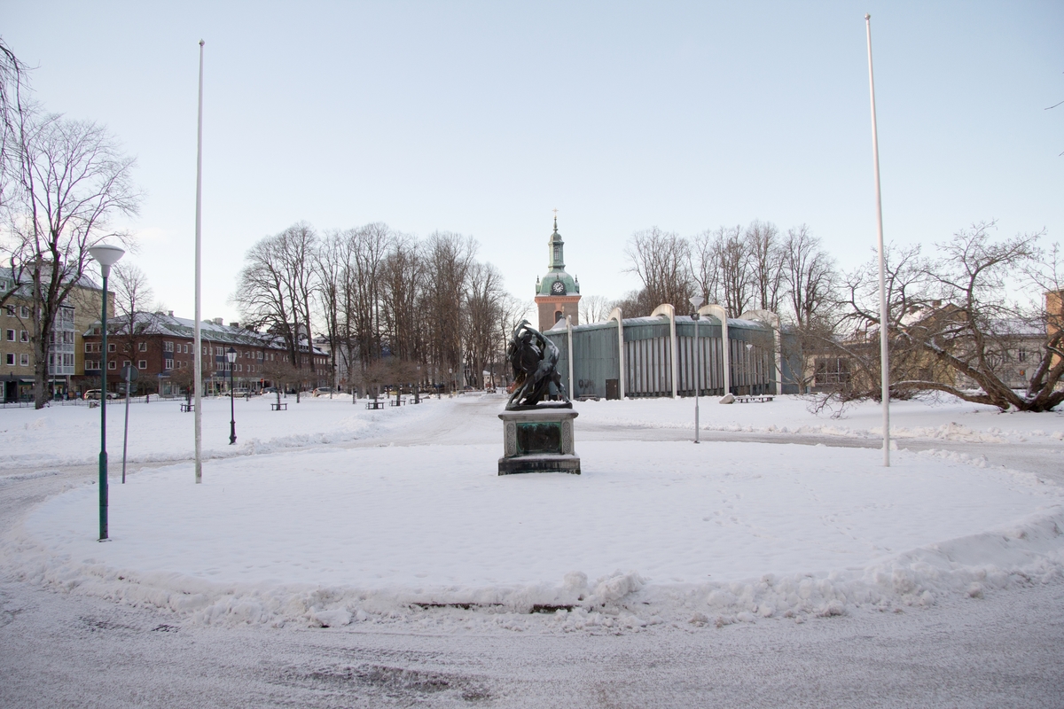 Titel: Vänersborg, Kvarteret Läroverket. Aulan och statyn Bältesspännarna.