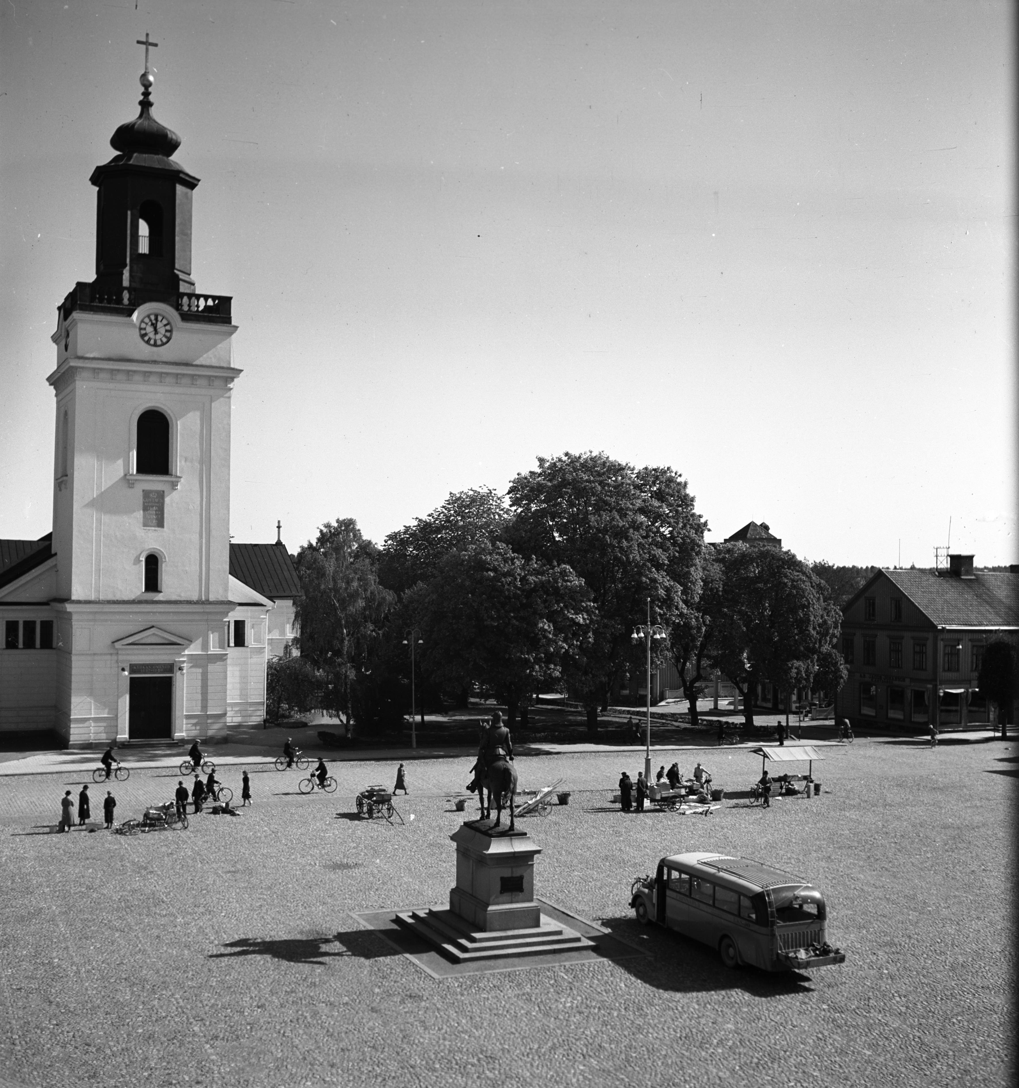 Stora torget med Eksjö kyrka och en ryttarstaty som föreställer en soldat från Smålands husarregemente. Bilden tagen på 1940-talet.