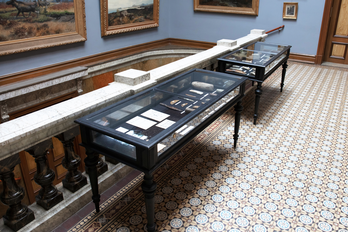 Titel: Vänersborgs museum, trapphallen. Utställning om Vänersborgs läroverks fornsakssamling