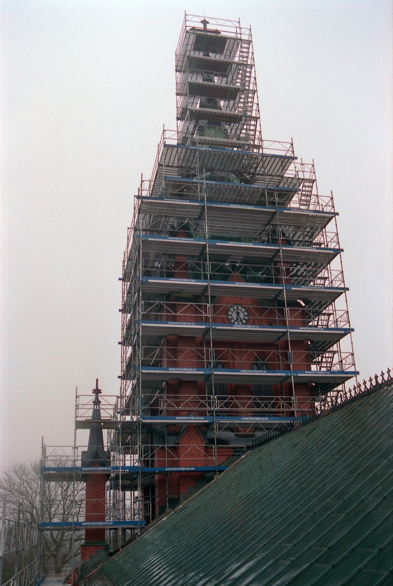 Trollhättans kyrka under pågående renovering, tornet, östra fasaden