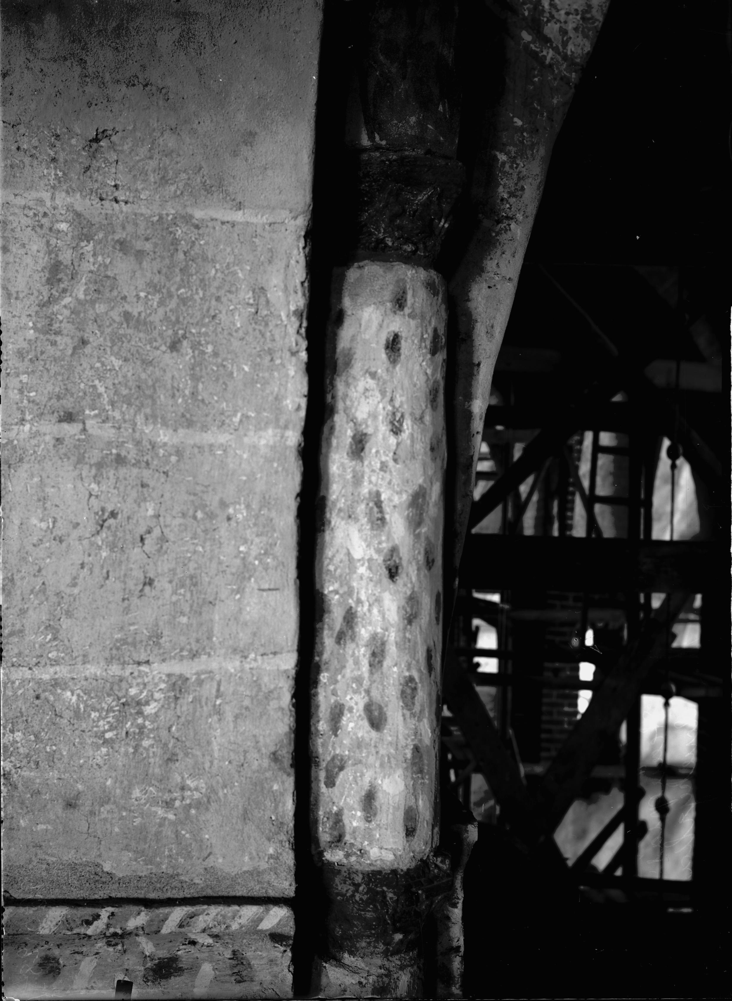 Hörnkolonn, kapitäl i skulpterat tegel.