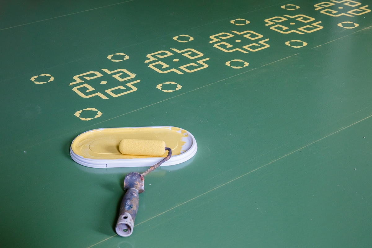 Vänersborgs museum. Schablonmålning av golvet i vaktmästarbostaden.