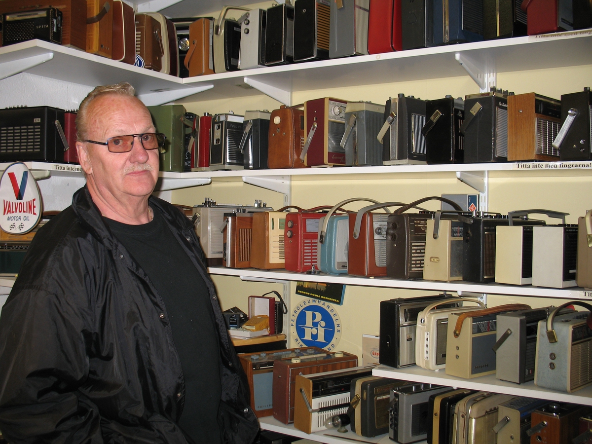 Jan-Erik Johansson fotograferad med sin samling av transistorapparater. Vänersborg