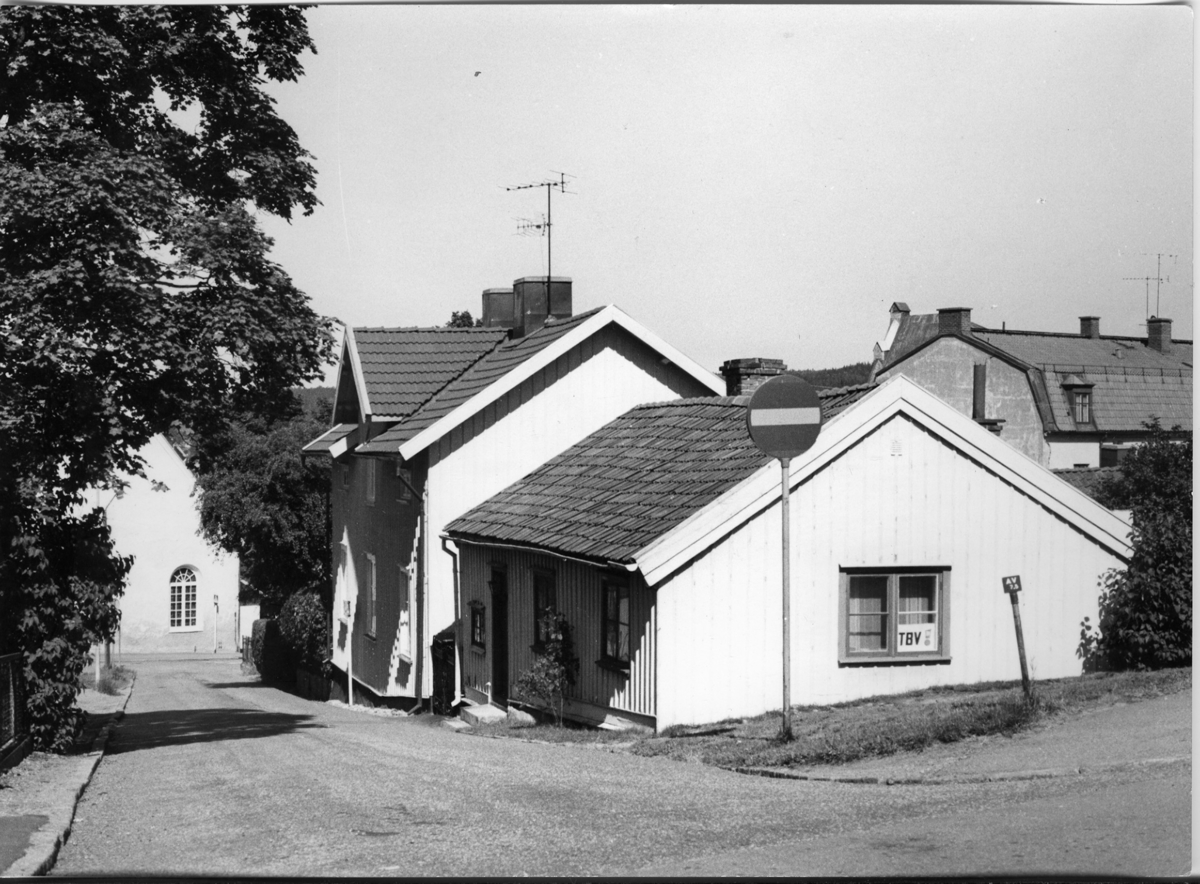 Ulricehamns sn, Brohusgränd med nordsidans hus. T.V. i bakgrunden kyrkan, närmast T.H. det lilla brohuset