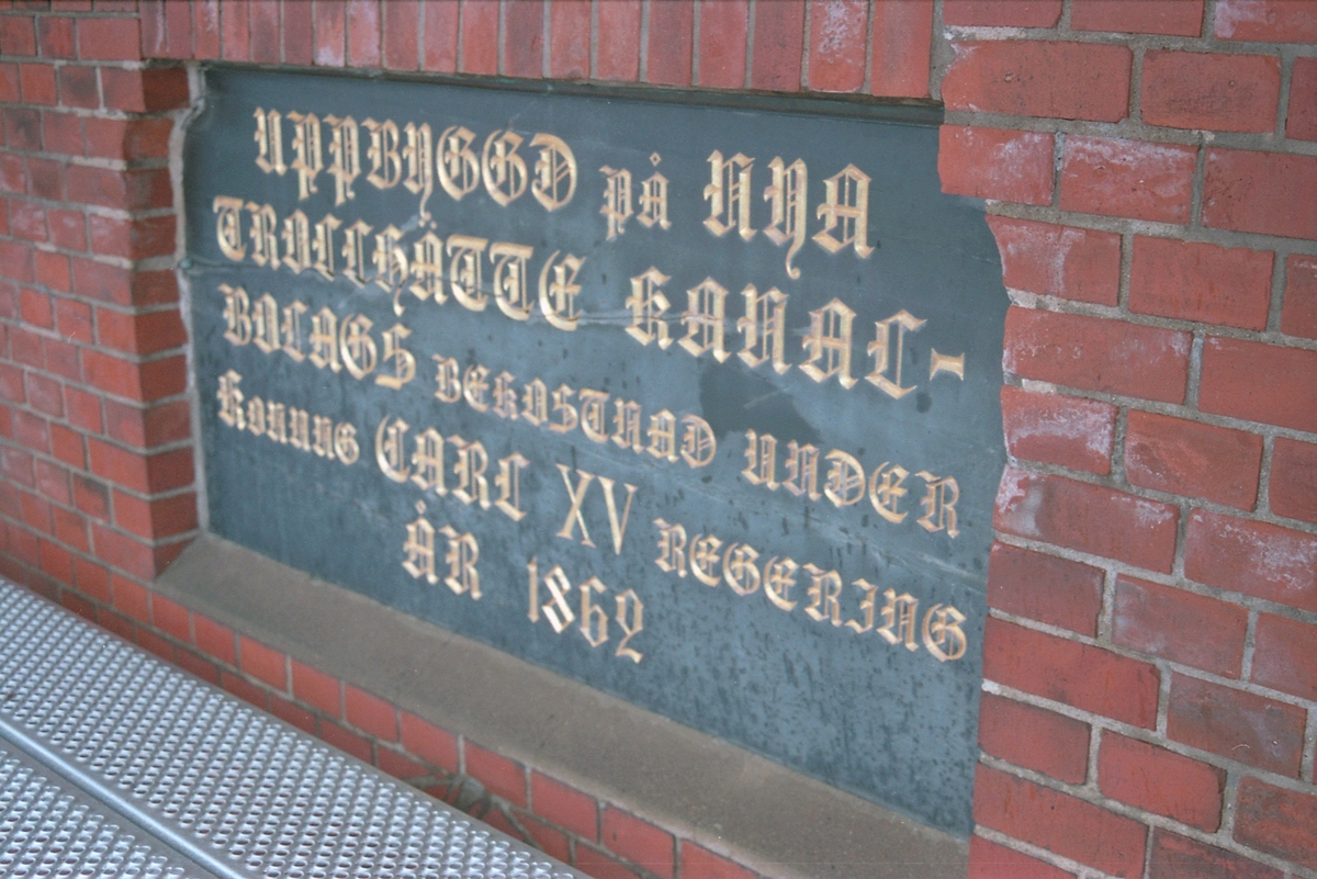 Trollhättans kyrka under pågående renovering, torn, västra fasaden, textplatta